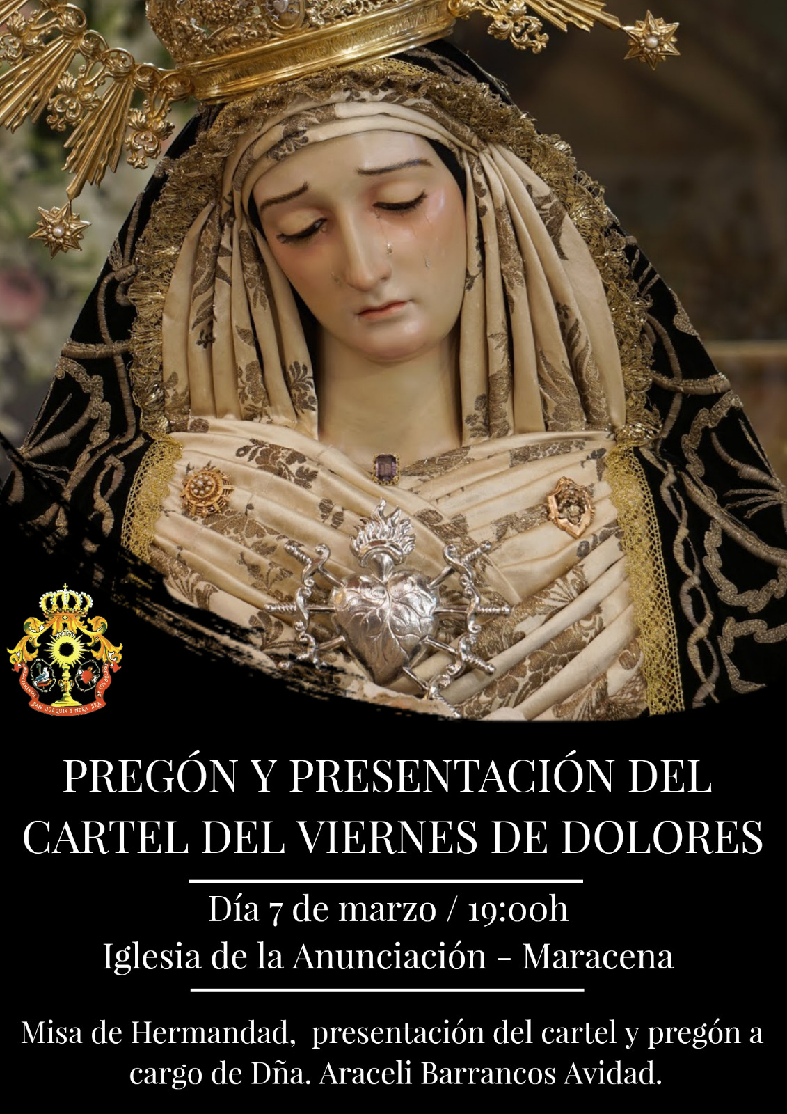 El próximo sábado 7 de marzo tendrá lugar el pregón y presentación del cartel anunciador del Viernes de Dolores del 2020, tras la celebración de la Eucaristía de Hermandad a las 19:00h, en nuestra Iglesia Parroquial de la Anunciación.
